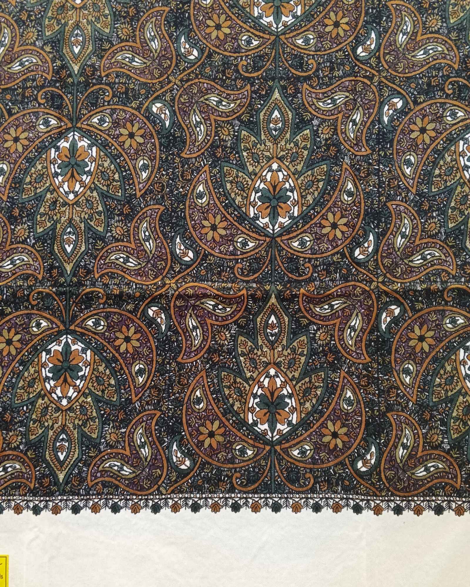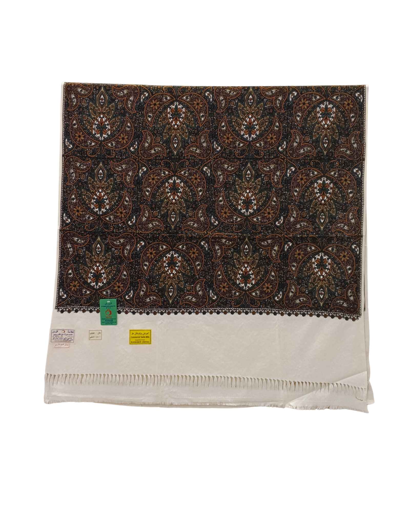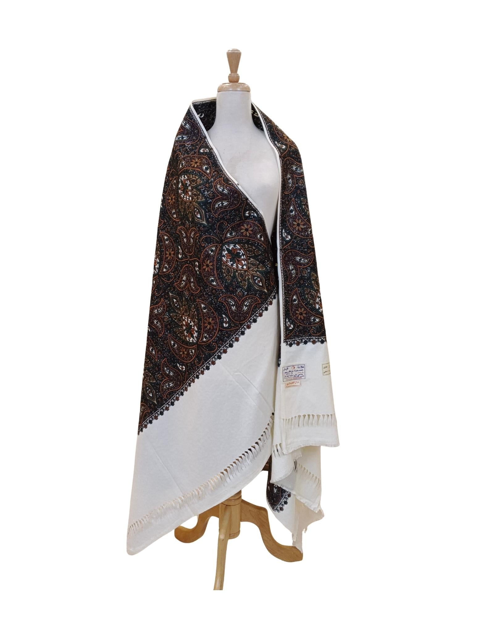 شال كشميري فاخر نُسج في كشمير الهند على خلفية بيضاء كريمية ناعمة من بوليستر راق. يغطيه تطريز يدوي كثيف يمتد من طرف إلى طرف بخيوط صوف سميكة تبرز تفاصيل الزخرفة بوضوح. الحواف المضفرة تمنح الطراز الكلاسيكي لمسة عصرية تزيده تألقاً. يبلغ طوله مترين وعرضه متراً واحداً، فيمنح غطاءً واسعاً يلف الجسم براحة وأناقة. يجمع بين نعومة البوليستر ودفء الخيوط الصوفية المطرزة في قطعة واحدة فاخرة. يصلح للمناسبات الرسمية والاجتماعات الكبرى التي تتطلب طابعاً راقياً.