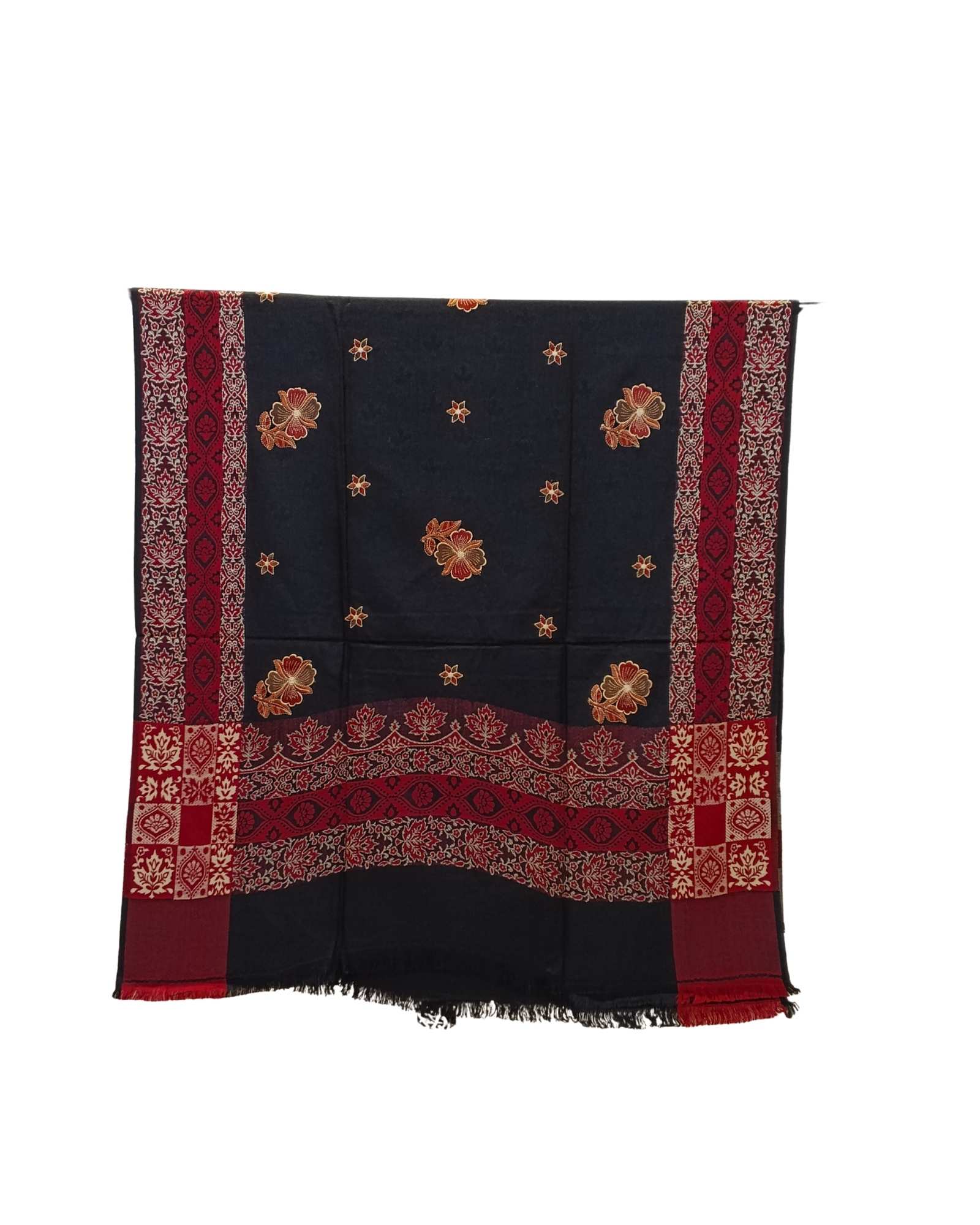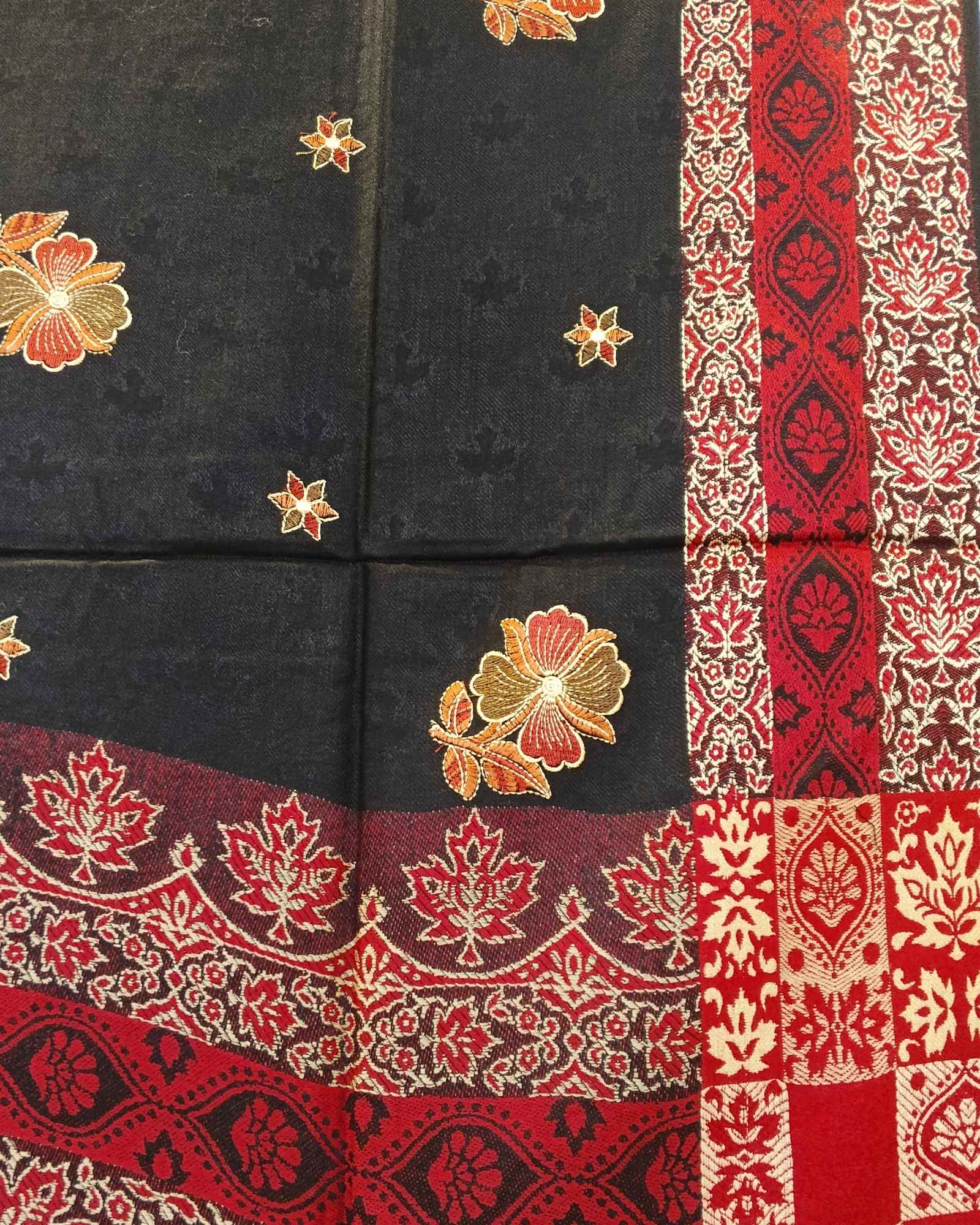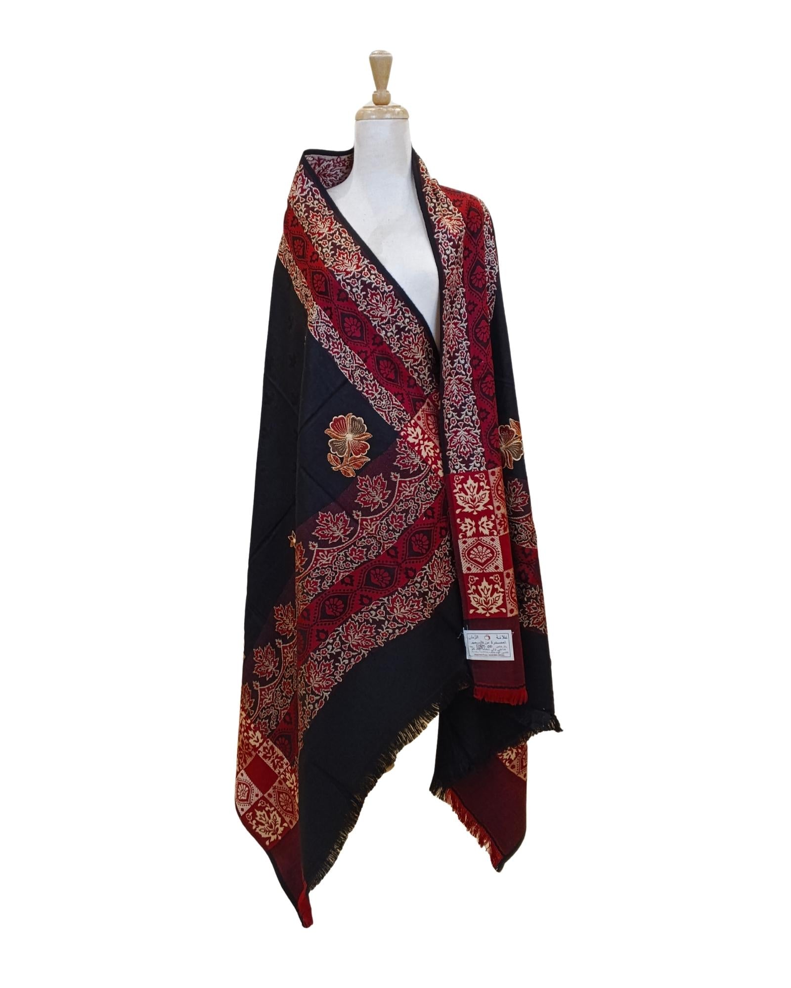 شال أسود فاخر من كشمير، يحمل تطريزاً خارجياً بلون ذهبي لامع وحياكة داخلية بنقش شرقي بلون أحمر