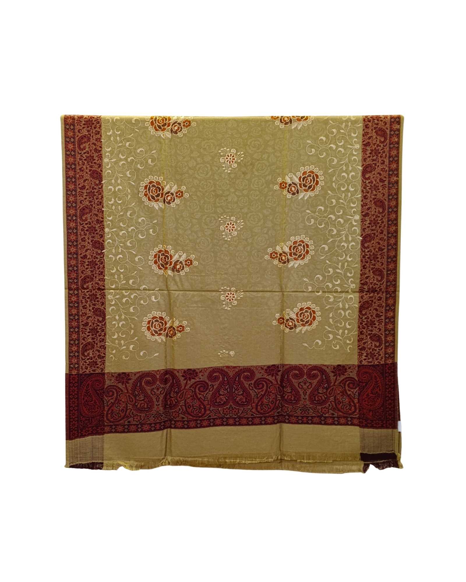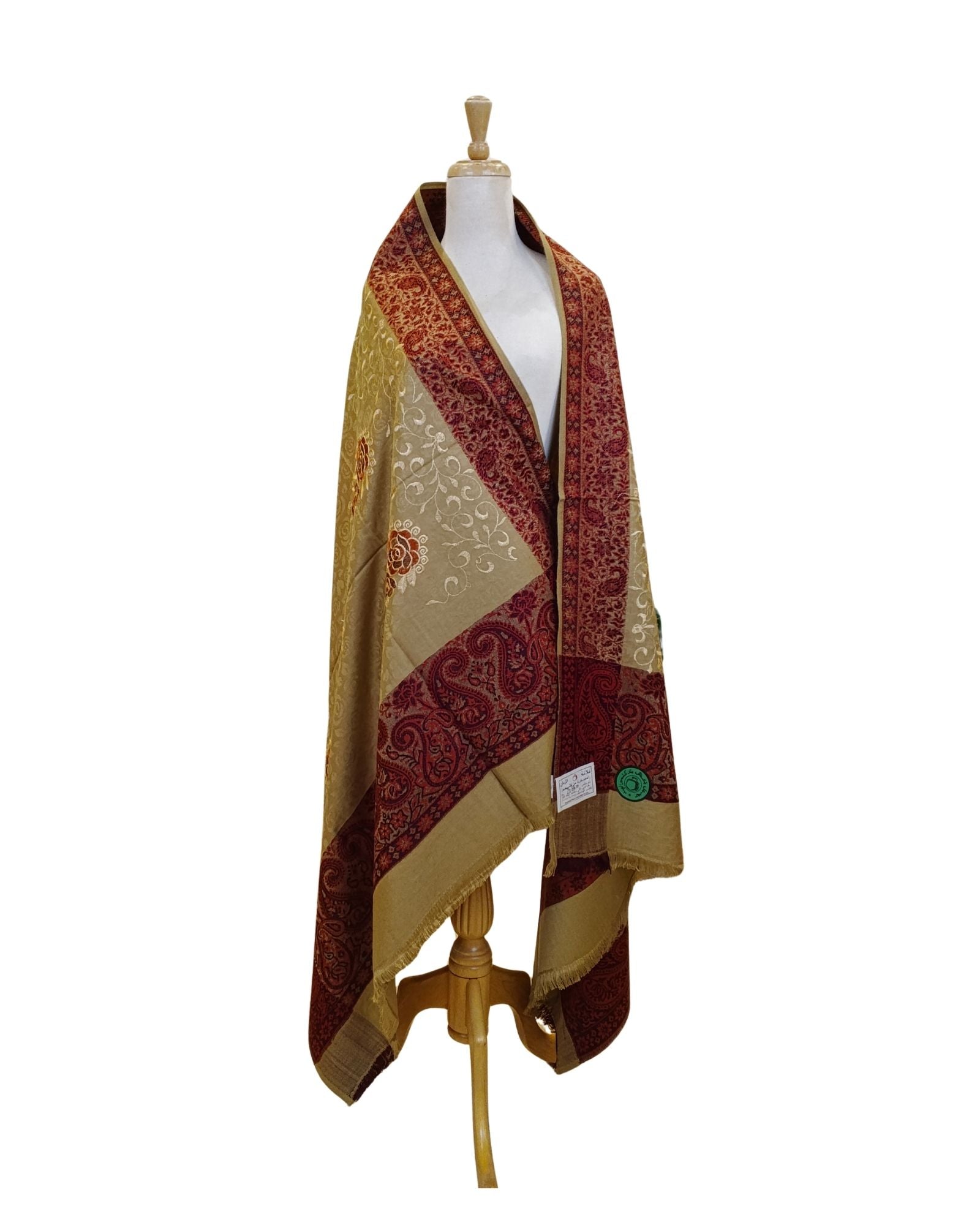 شال كشميري بني دافئ، يُزينه تطريز خارجي أحمر جريء وحياكة داخلية بنقش شرقي أحمر غني.
