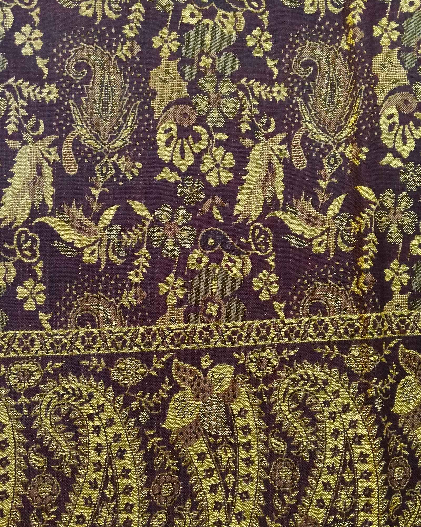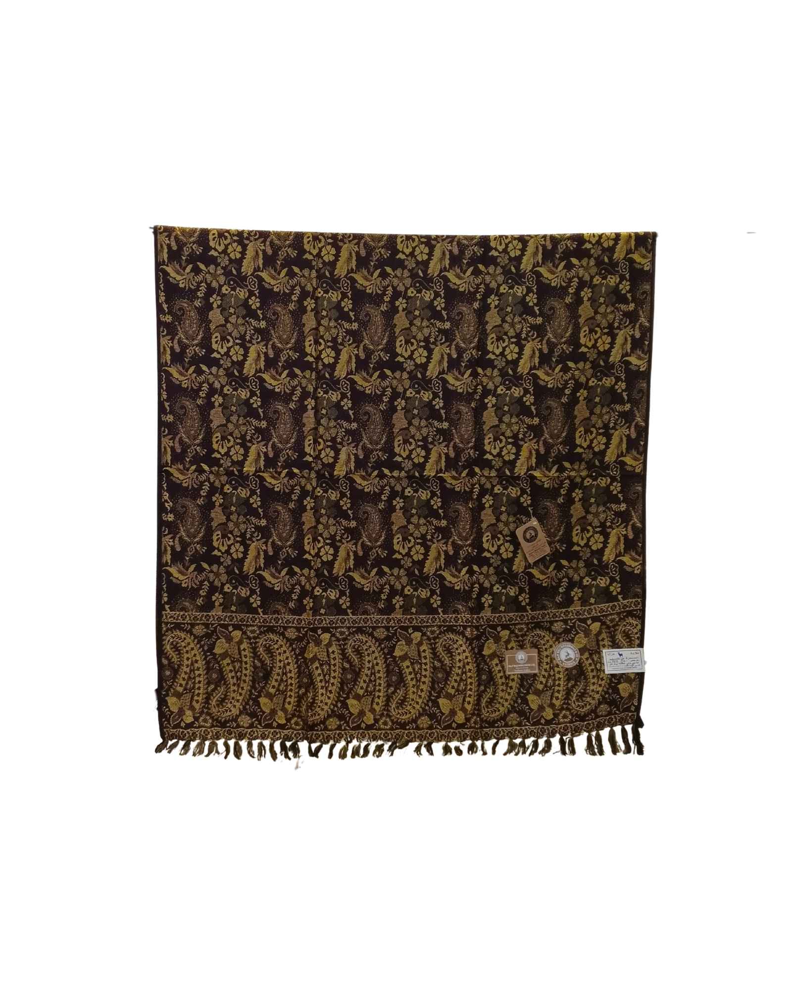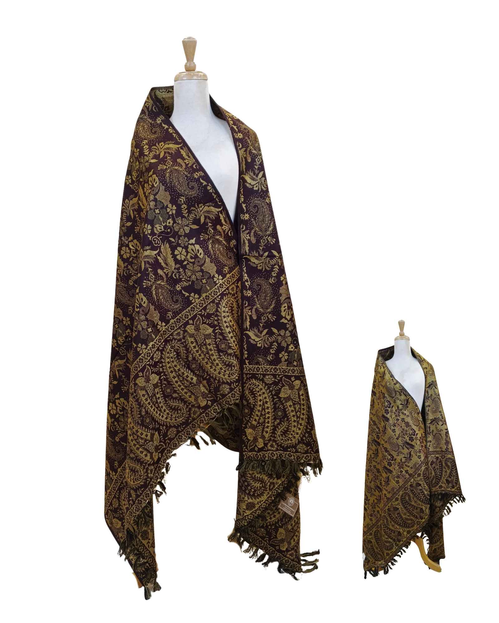 شال كشميري فاخر بوجهين: وجه بني محمر دافئ تزينه زخارف معدنية منسوجة داخل النسيج، ووجه ذهبي لامع ترسمه خيوط بنية رفيعة بنقش شرقي قديم.
