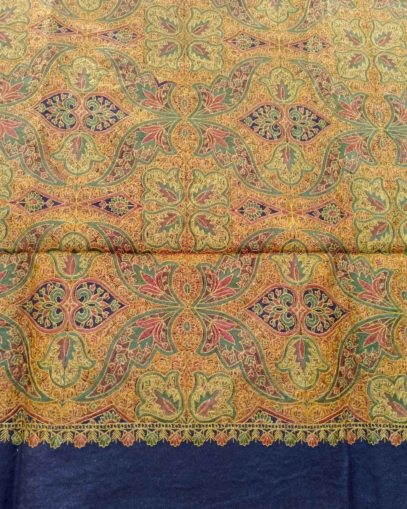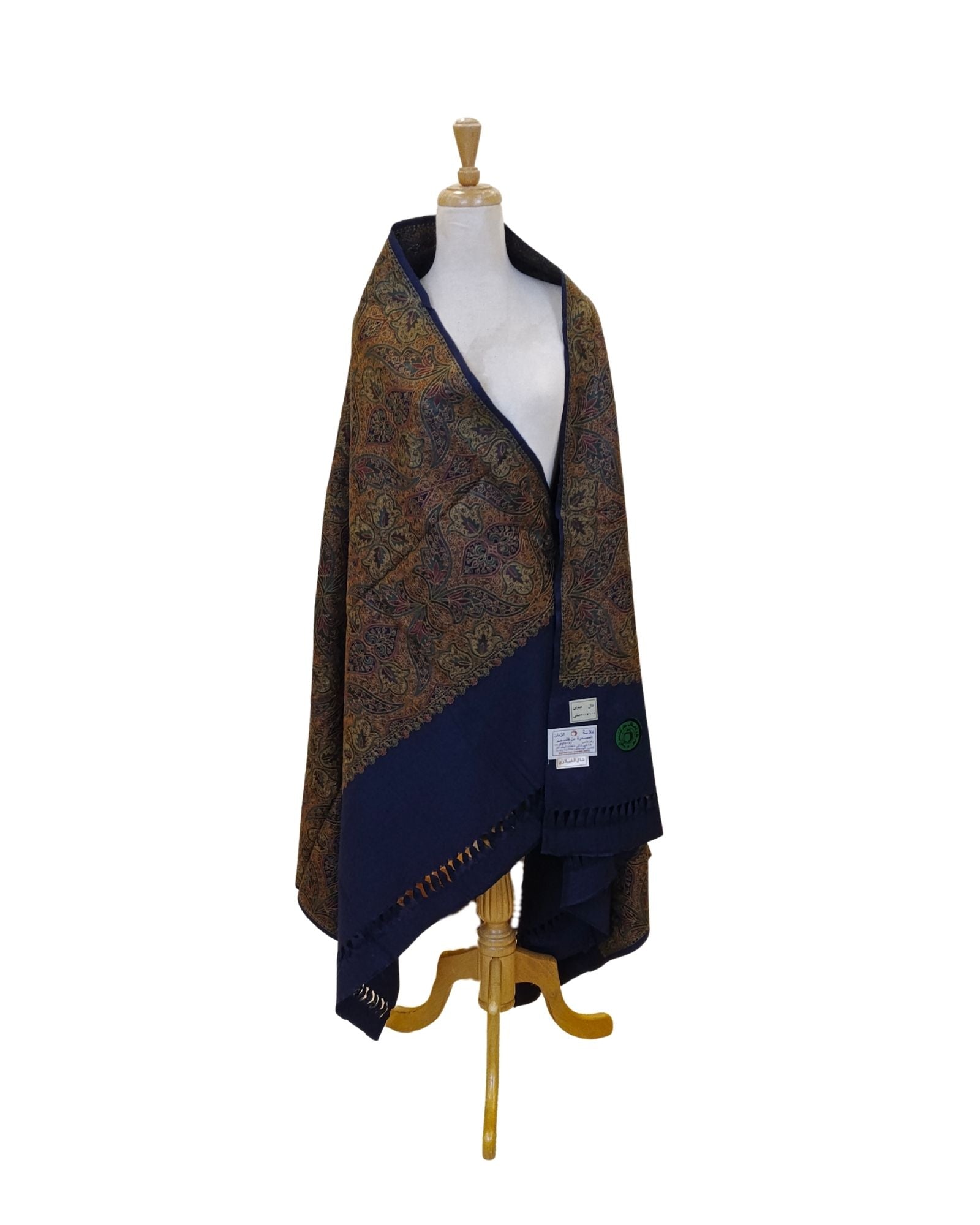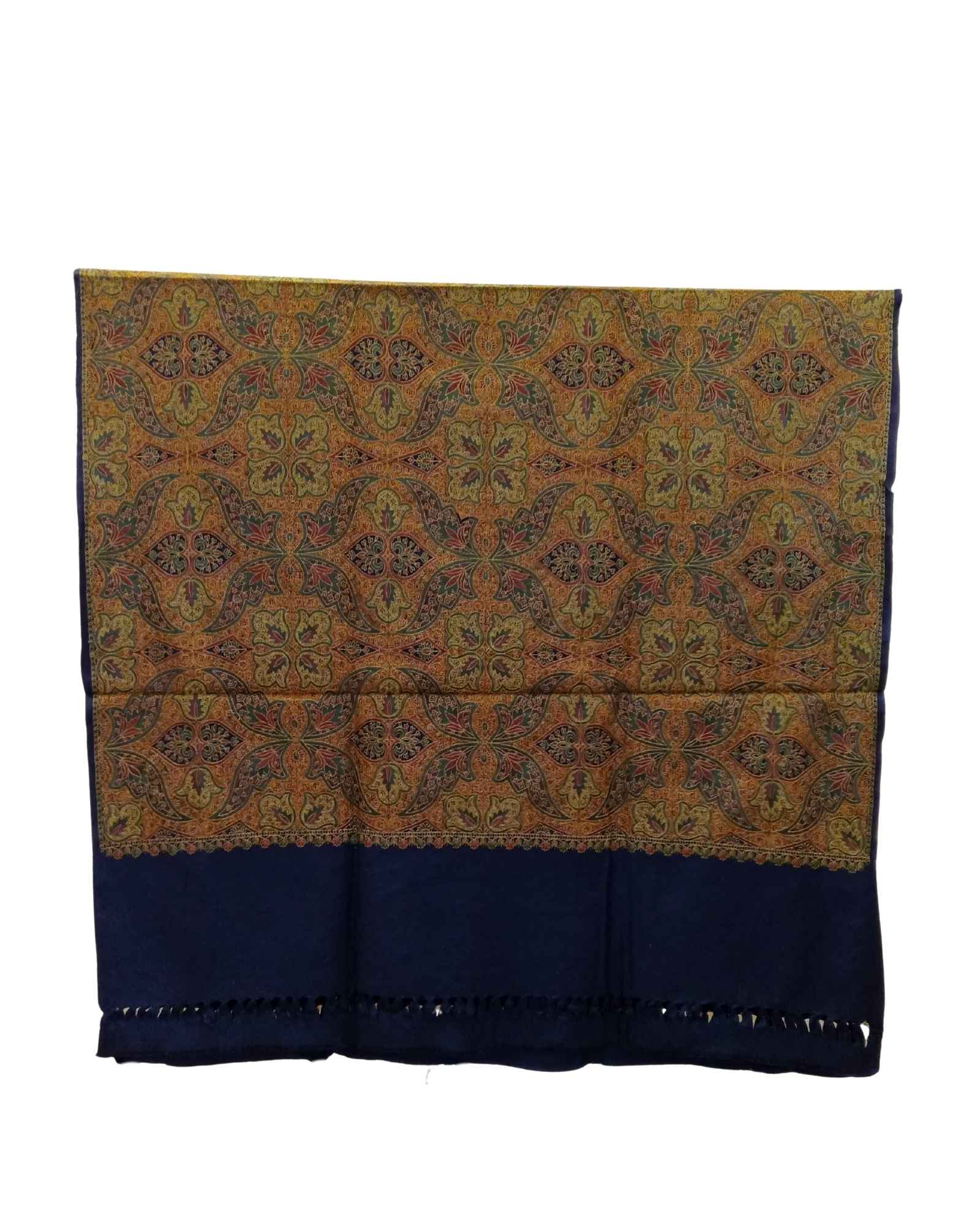 شال كشميري فاخر مصنوع في كشمير الهند، بأرضية قماش كحلية عميقة من البوليستر الناعم.